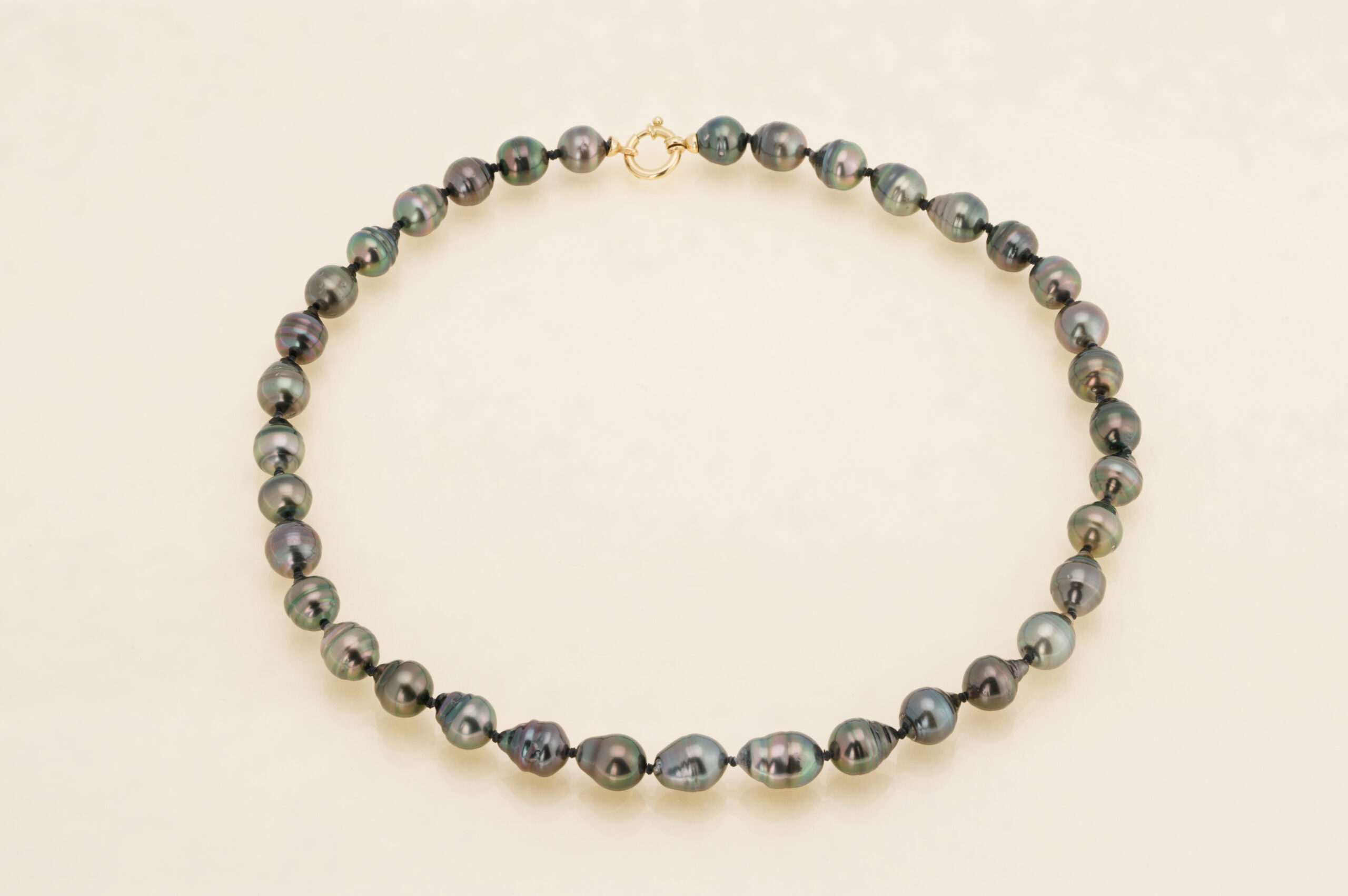 Die Halsketten sind auf Seidenfaden mit Knoten zwischen jeder Perle aufgereiht.